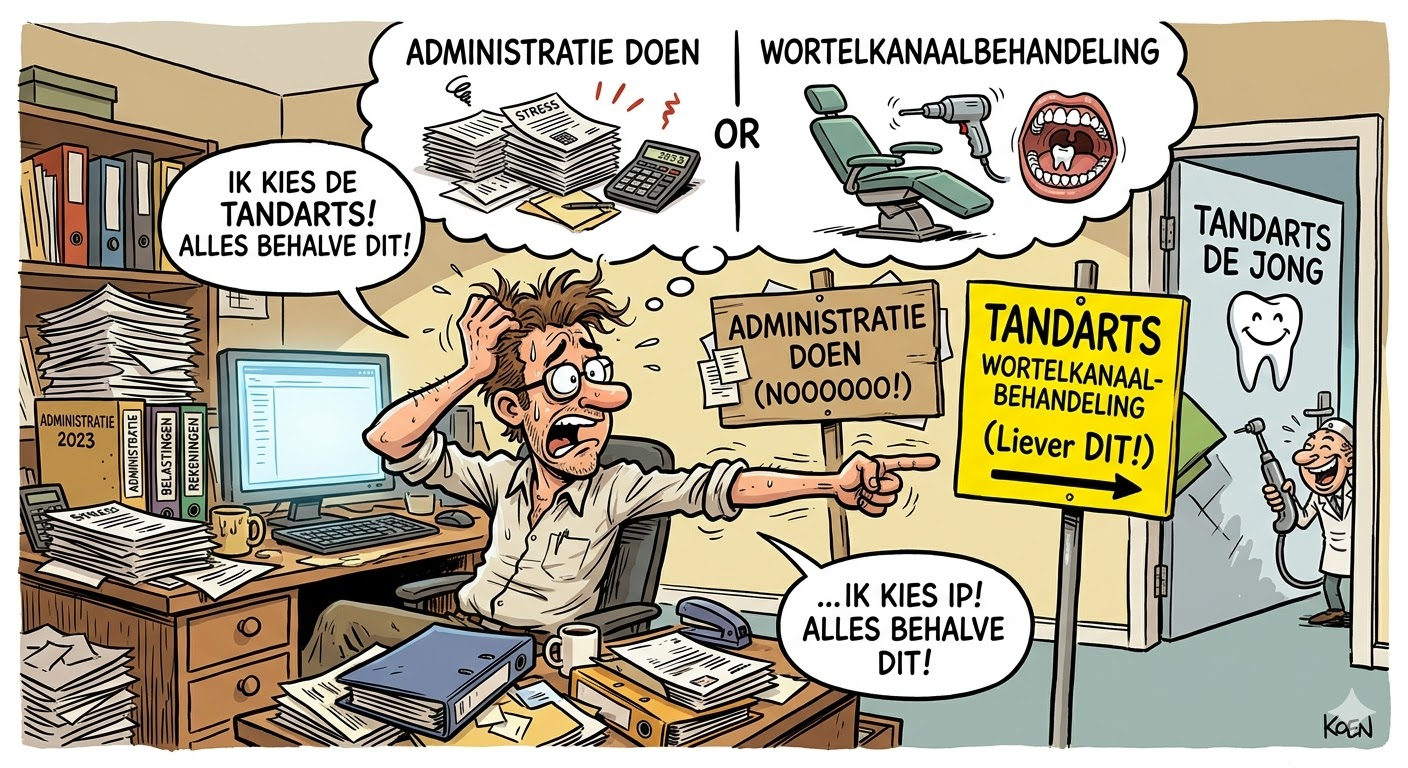 Ik maakte op een gegeven moment de opmerking: ik ga m’n tandarts bellen of hij tijd heeft voor een wortelkanaalbehandeling, dat is een stuk prettiger dan weer een volgende stap in die administratie. Mijn collega maakte hier een grappig plaatje van via AI en toen had ik in ieder geval weer een reden om een artikeltje te schrijven.
